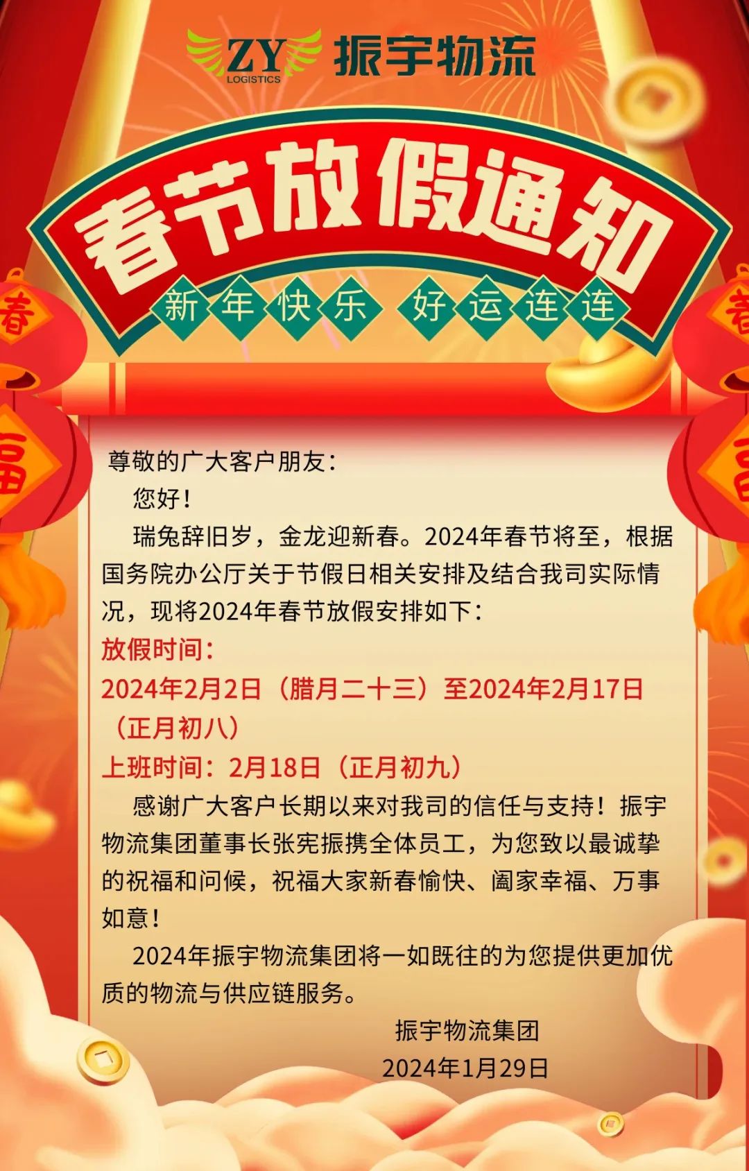 振宇物流集團丨2024年春節放假通知