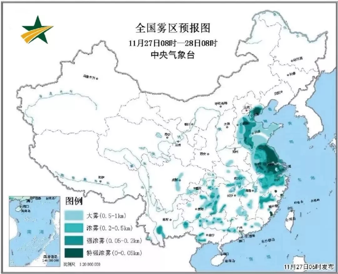 中央氣象台11月27日06時繼續發(fā)布大霧橙色預警,27日早晨至28日早晨 ,華北中東(dōng)部、黃淮東(dōng)部和南部、江淮、江漢平原的部分地區将有大霧,其中河北東部、山東西南部、安徽東部、江蘇、上海、浙江北部等地有濃霧或強濃霧,局地有能見度不足50米的特強濃霧 。預計華東地區的大霧天氣會一直持續到12月2日,長(zhǎng)達(dá)一周。